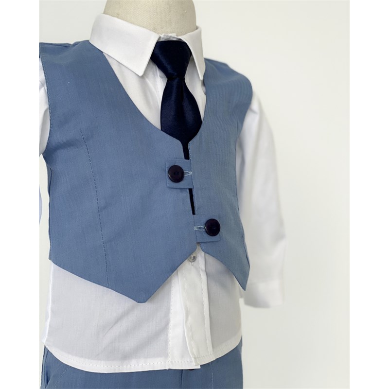 Plavo odijelo s tamnoplavom kravatom i jedinstvenim kopčanjem prsluka savršen je izbor za Vašeg malog princa ako želite napraviti spoj klasike i modernog.  Tamnoplava kravata i zanimljivo kopčanje prsluka ističe ljepotu ovog odijela, dajući mu sofisticiran izgled. Kopčanje prsluka dodaje dozu jedinstvenosti koju druga odijela nemaju.