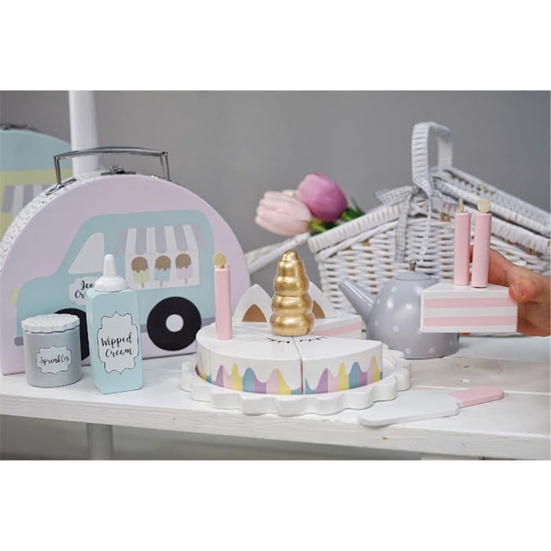 Cijela torta napravljena je od drveta i uključuje 6 komada torte, jednorogov rog, svijeće i malene uši, a tu je naravno i prekrasni pladanj za tortu i špatula za lakše serviranje.