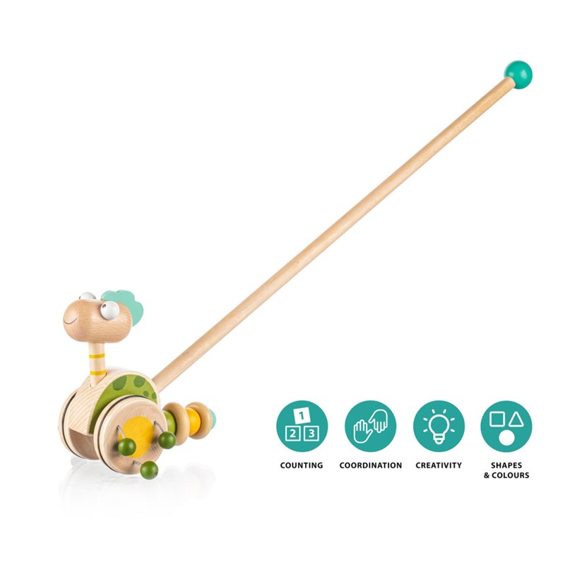 Guralica idealna igračka za djecu koja počinju hodati. Zabavni dinosaur na dugačkoj drški vrti se dok se kreće i zahvaljujući drvenim perlama pričvršćenim na kotačićima proizvodi zvuk koji će mamiti dijete na hodanje i zabavljati ga satima. Čvrsti stup također služi kao oslonac za bebine prve korake, a na kraju je opremljen drvenom kuglom za dodatnu sigurnost. Klizač nema oštre rubove i izrađen je od izdržljivog, dugotrajnog drva.